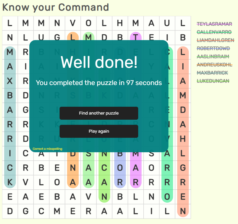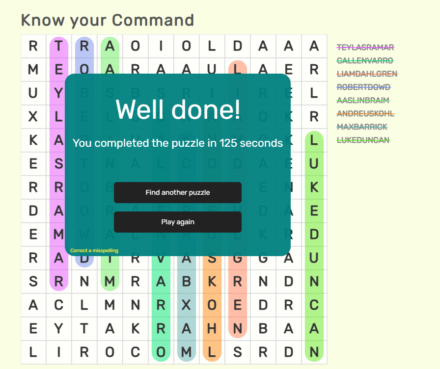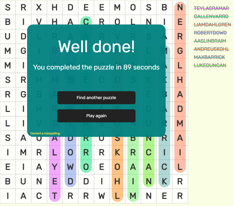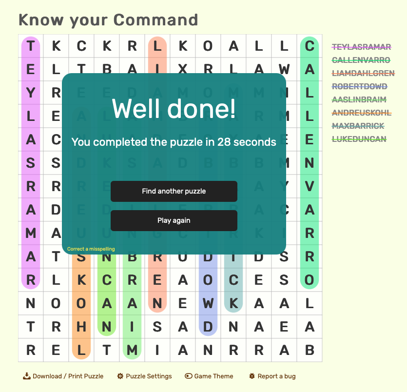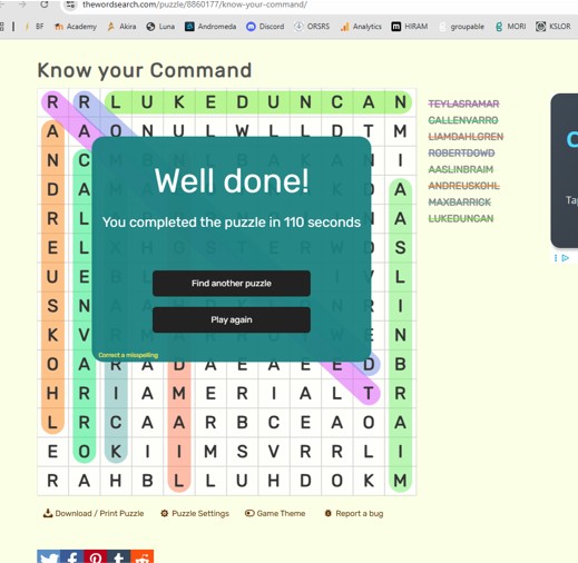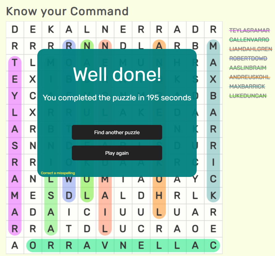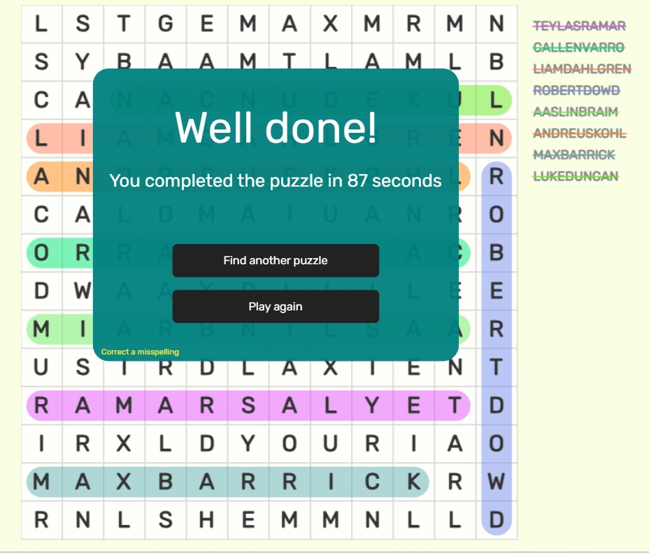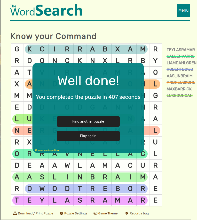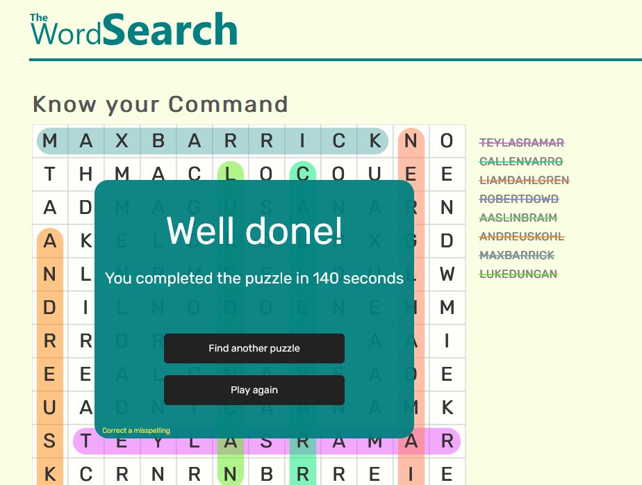 - Submissions should be in the form of a screenshot of the completed word search, clearly showing the time completed and the completed word search.
