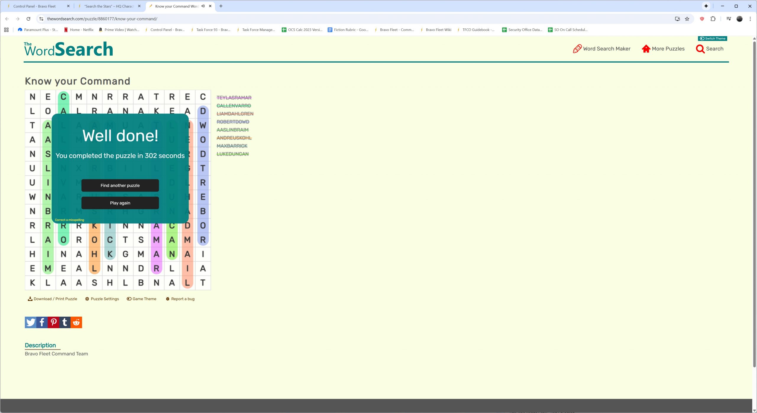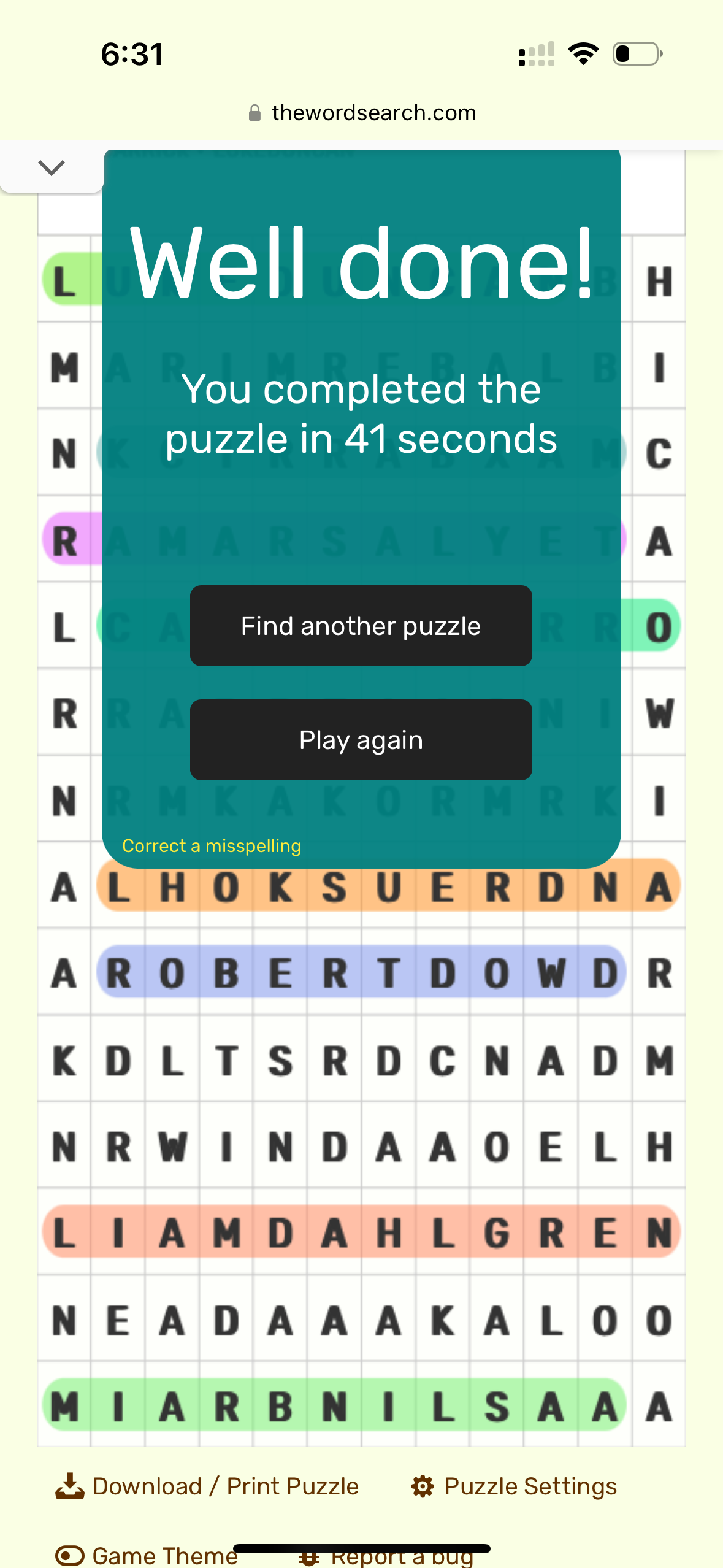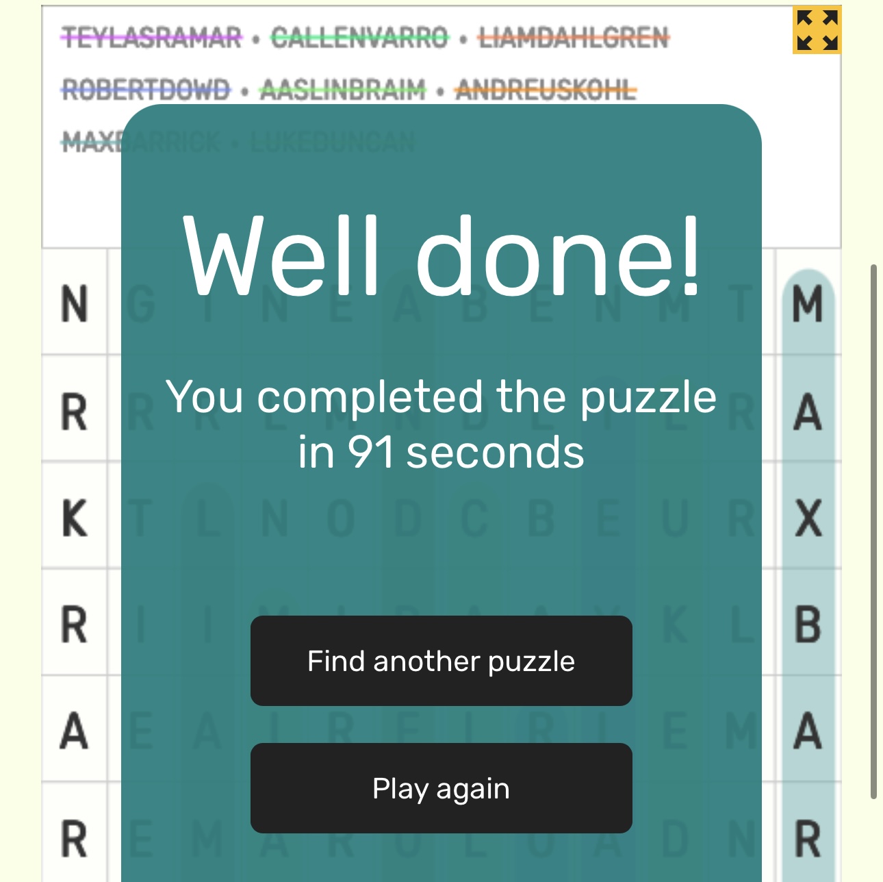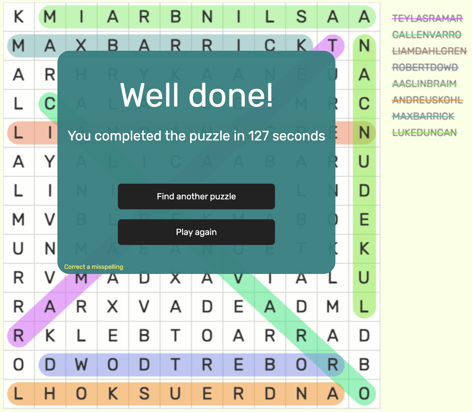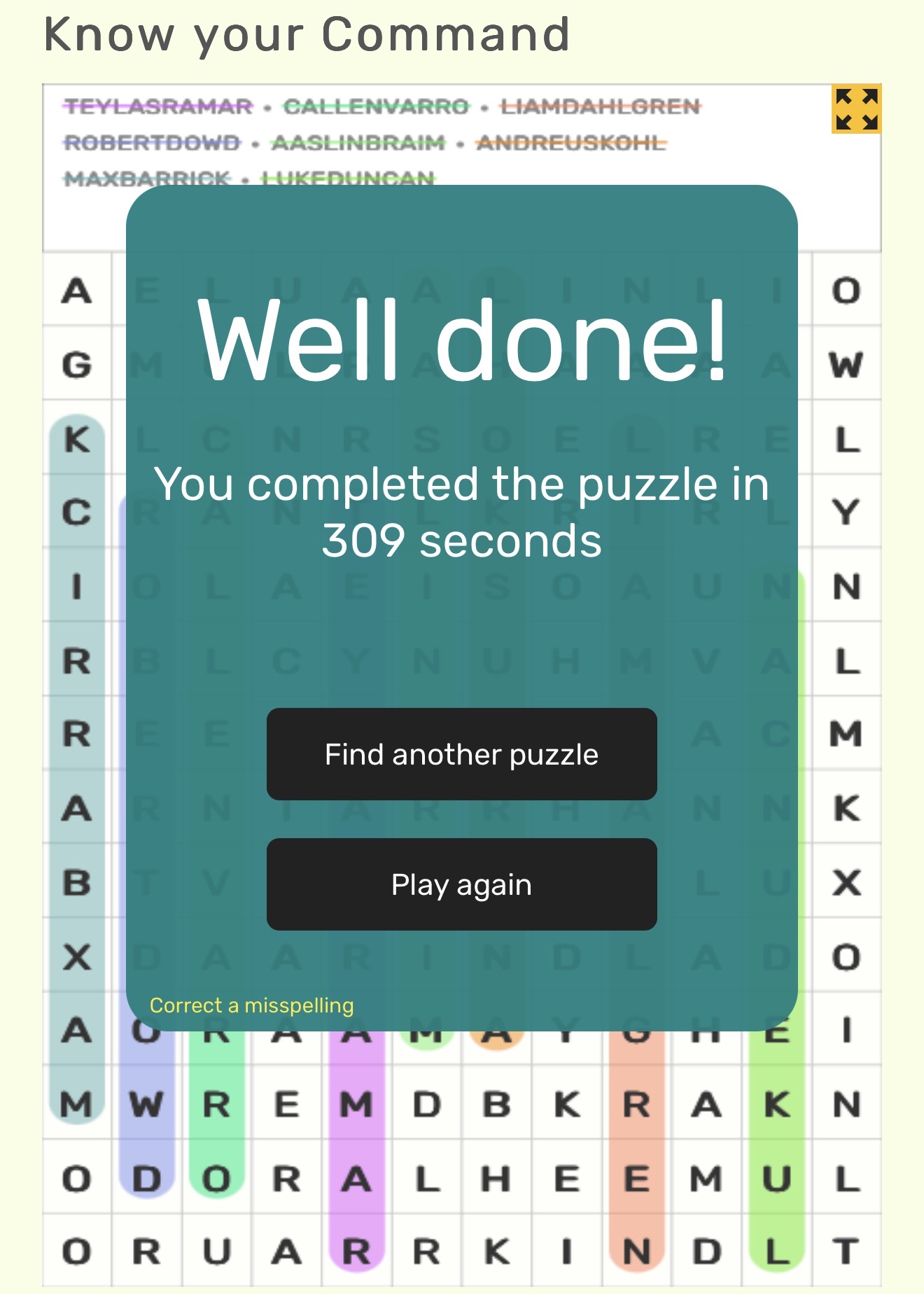 - Submissions should be in the form of a screenshot of the completed word search, clearly showing the time completed and the completed word search.